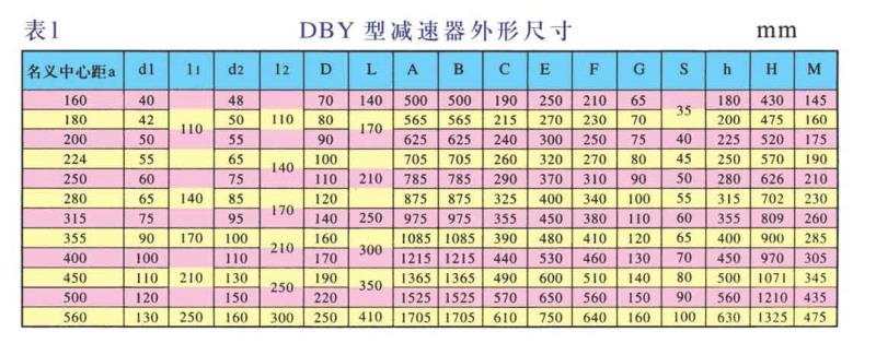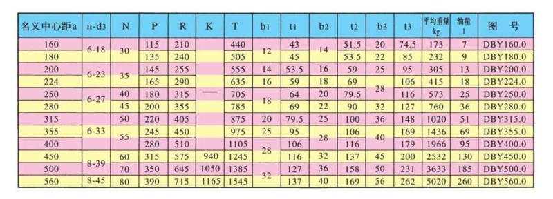 DBY、DBYK、DBZ型減速機(jī)各有12種規(guī)格,名義中心距為:160,180,200,224,250,280,315,355,400,450,500,560mm每種規(guī)格均有5種傳動比(8,10,11.2,12.5,14)兩種旋向,四種裝配型式,分別組成240種減速機(jī)。